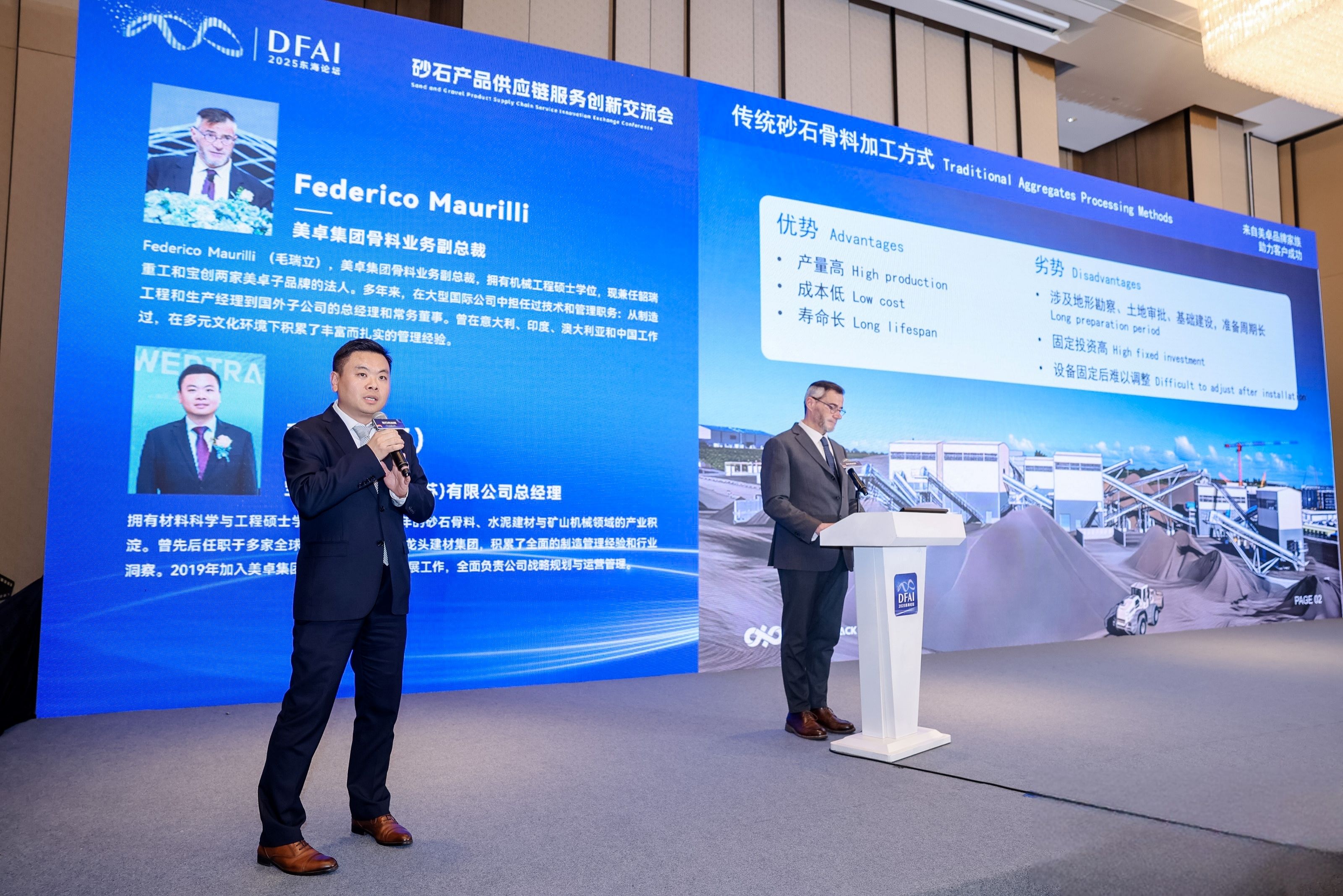 美卓多品牌以矩阵形式集体亮相,通过各品牌展位的协同展示,深化了行业对其多品牌协同助力客户成功理念的认知。现场,各品牌展位通过“集章有礼”的趣味互动形成联动,成功吸引了众多参会者驻足与交流。宝创作为绿色移动式破碎筛分站制造商,应邀出席砂石产品供应链服务创新交流会,美卓骨料业务副总裁Federico Maurilli先生和宝创总经理魏璟先生代表宝创,与业内人士共同探讨移动式破碎筛分设备在骨料行业的创新应用。