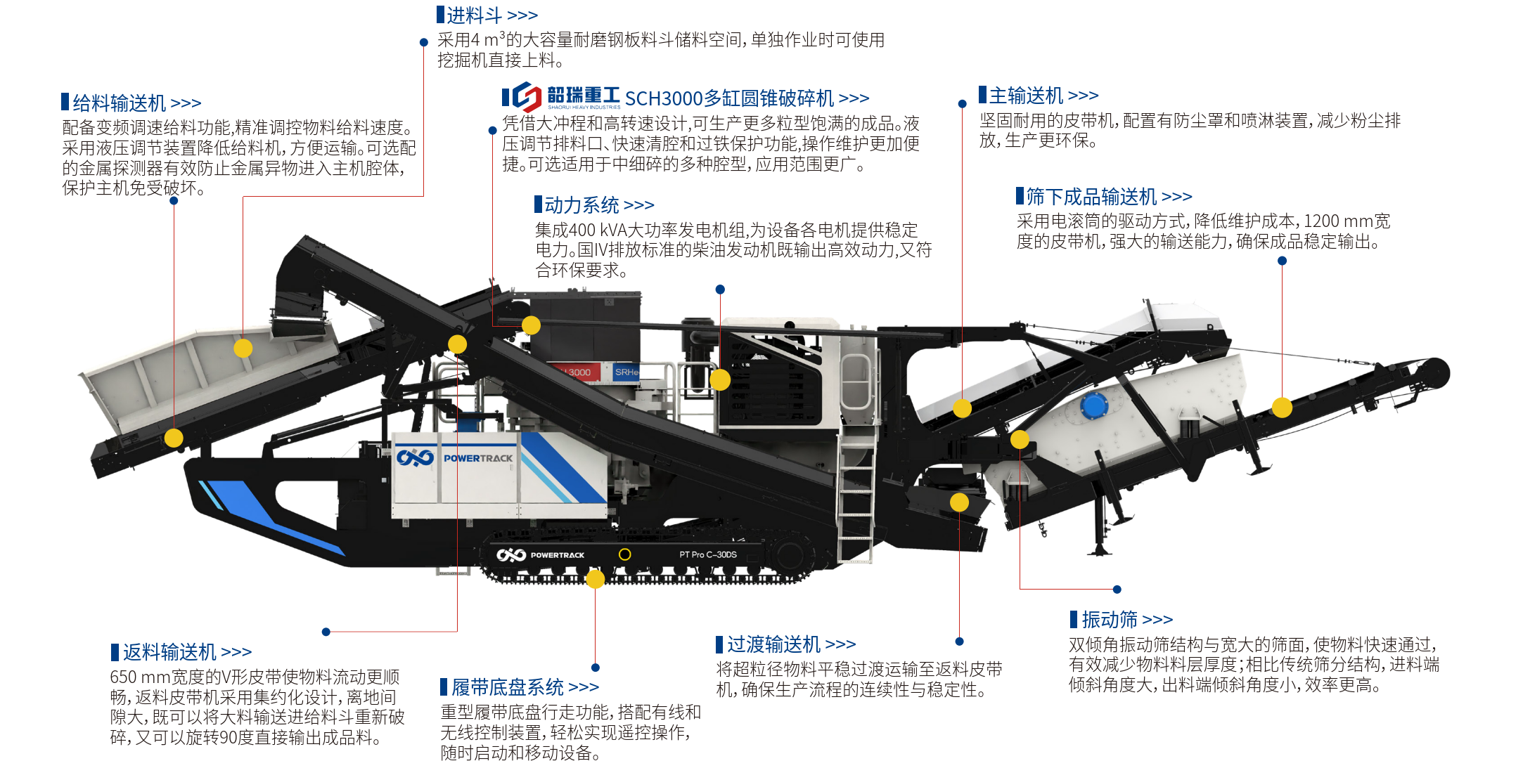 | 工作尺寸 长 x 宽 x 高 | 19,400×4,730×4,950 mm (含筛分单元) 16,300×4,630×4,400 mm (不含筛分单元) |